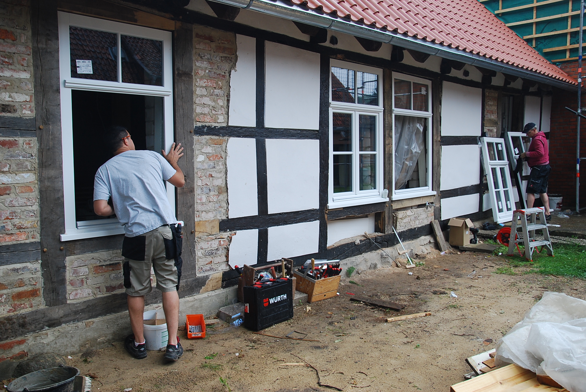 Bild: Handwerker sanieren ein altes Fachwerkhaus.