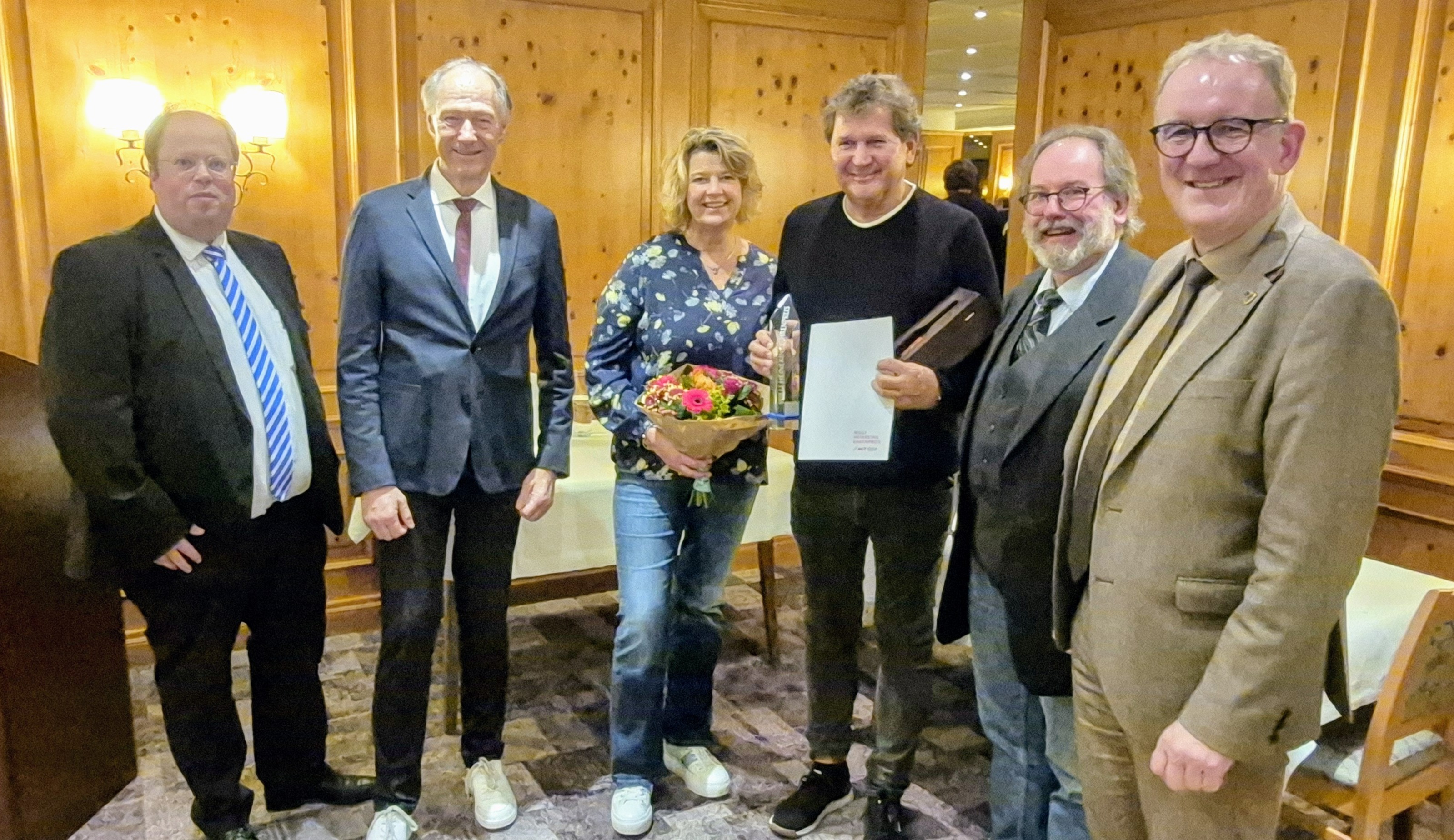 Bildunterschrift: (v.l.n.r.): Holger Rabbe, Kreisvorsitzender Michael Gillner, Anja Roess, Preisträger Thomas Roess, Bezirksvorsitzender Dietmar Reddig und Landrat Volker Meyer.